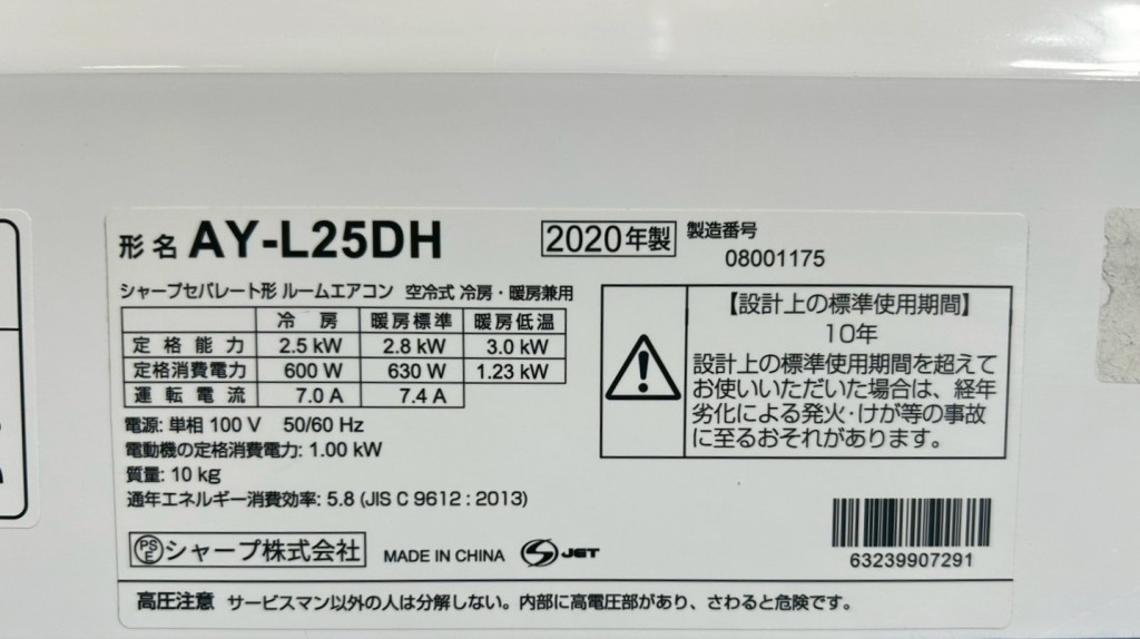 SHARP製2.5kw(8畳程度)2022年製 単相100V仕様